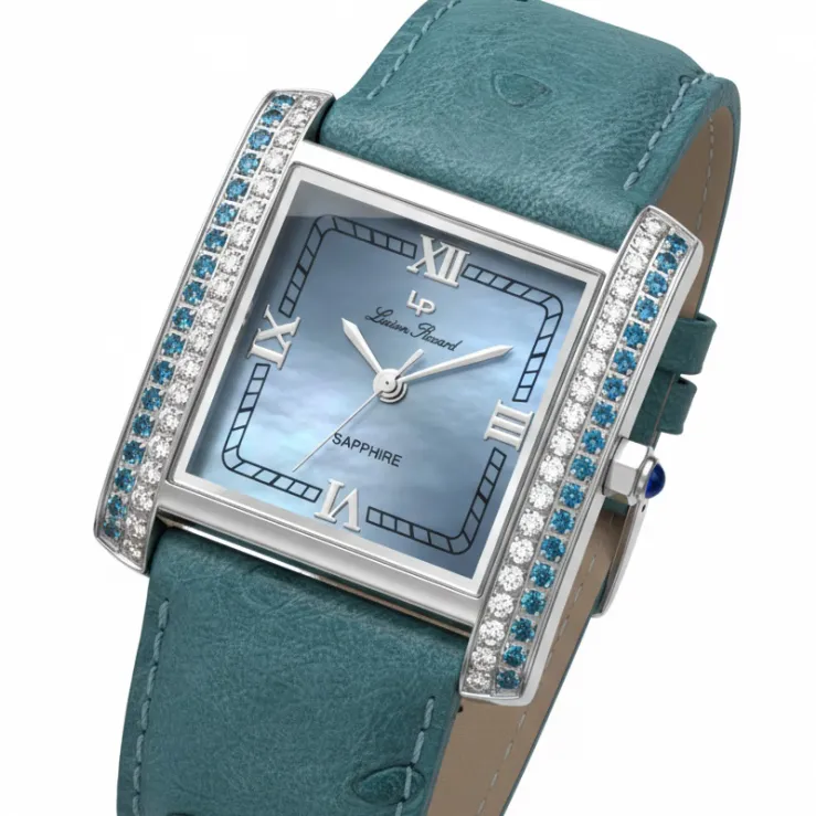 A Lucien Piccard diamond and abalone wristwatch. This piece features a blue, leather ostrich embossed band, an abalone dial, and a silver-tone bezel accented with diamonds and blue or black diamonds. The face features silver-tone leaf hands, with Roman and slash numeral indicators.