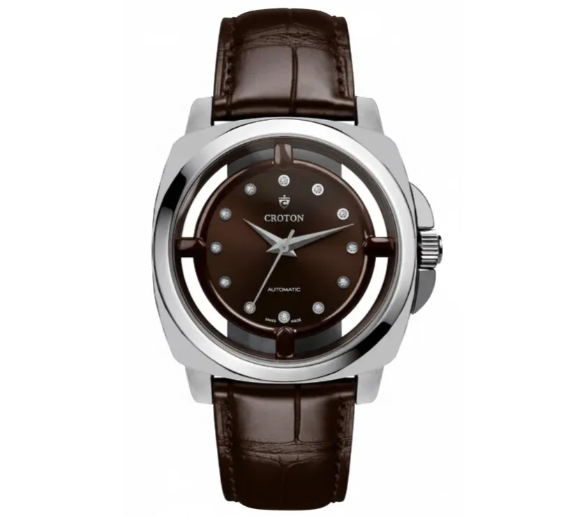 Elevate your presence with the Croton Automatic Swiss Made watch – a masterpiece of sophistication and elegance. Featuring a captivating dark brown dial, accentuated by dazzling diamonds and a matching dark brown alligator leather strap, this timepiece is more than just a time-telling device; it's a statement of refined taste.