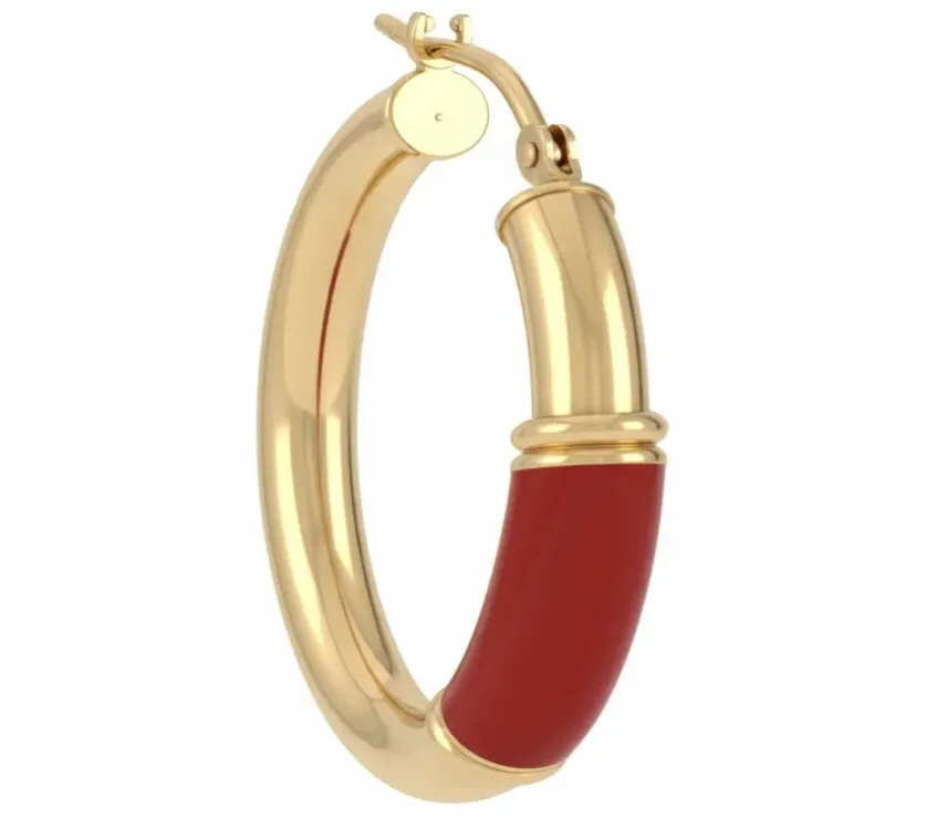 MB Red Enamel Work Round Tube Hoop Snap Earrings in 14k Yellow Gold